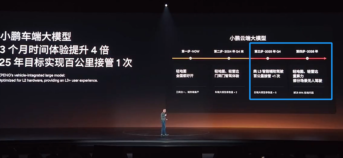 在小鵬AI科技日上,何小鵬還給出了從車端大模型到雲端大模型落地的“時間表”。比如,小鵬車端大模型2025年目標實現百公里接管1次,努力在18個月內實現類L3+智駕體驗。未來,小鵬高階智駕會逐步向輕地圖、輕雷達、重算力的方向演進