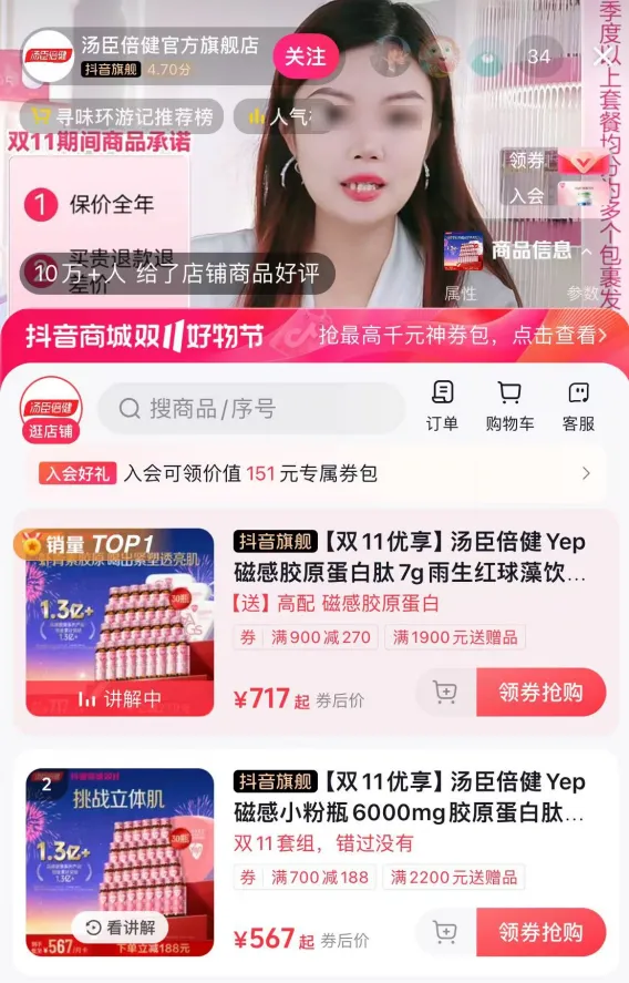 2024雙十一大促進行得正如火如荼,消費者湧入各大電商平台直播間下單囤貨。對比之下,湯臣倍健抖音官方旗艦店直播間顯得較為冷清。