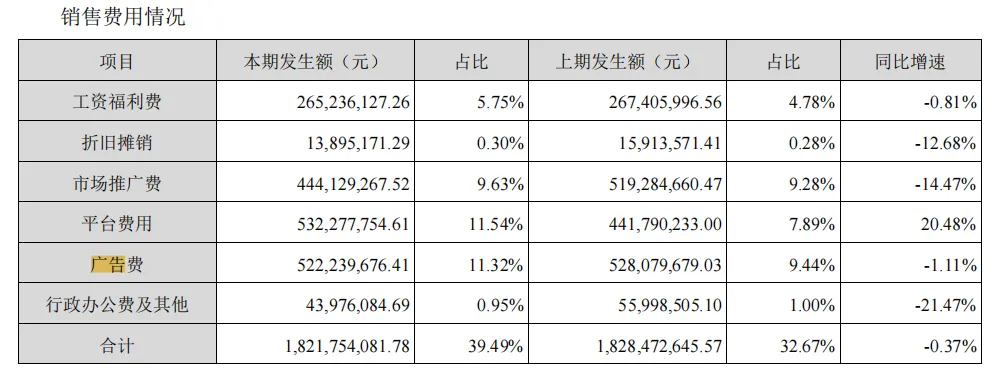 在今年的半年報中,公司的銷售費用為18.22億元,其中平台費用、廣告費和市場推廣費佔比居前。