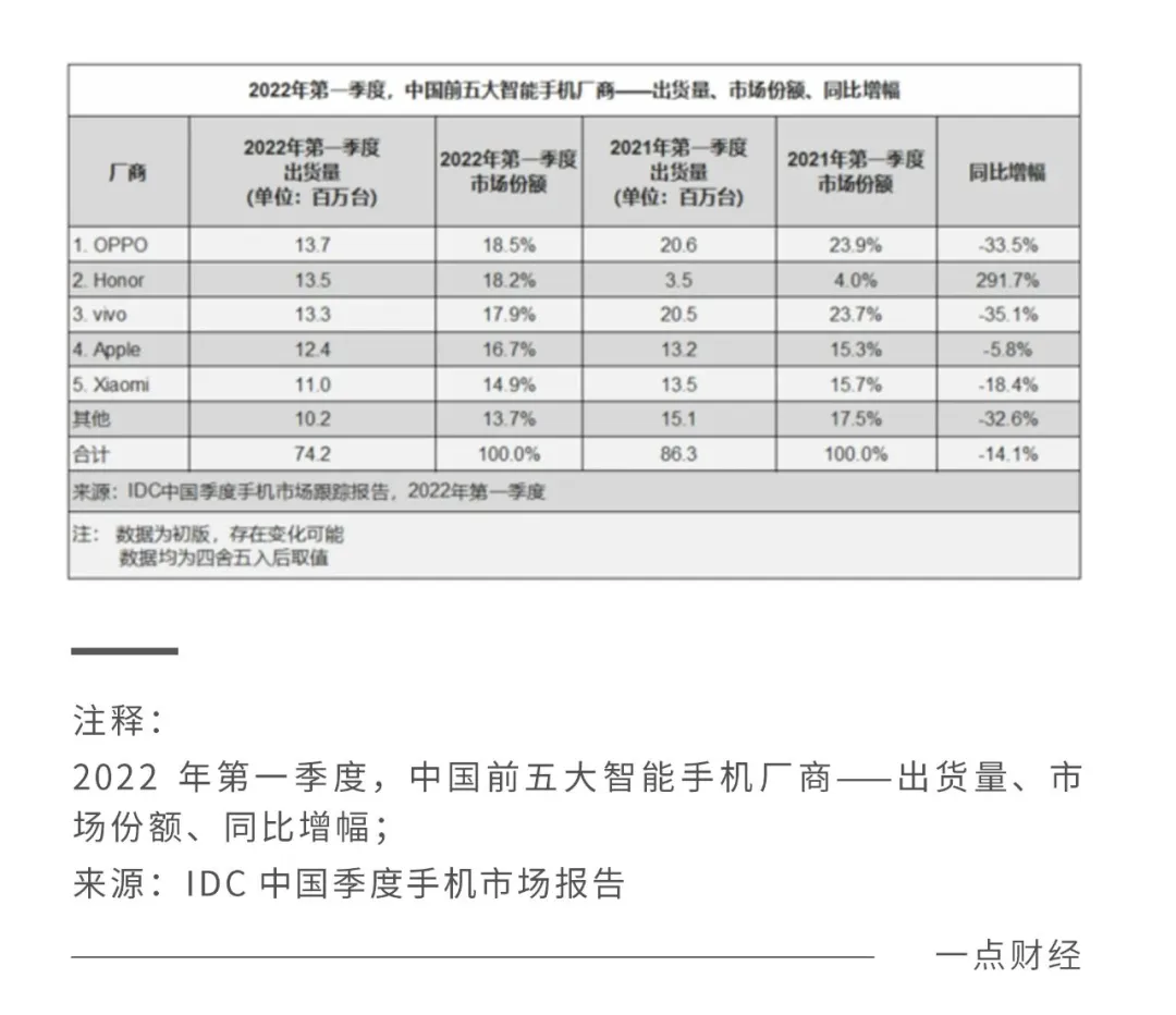 直到2021年第三季度,榮耀才轉危為安,實現大幅增長。2022年第一季度,市場分析機構IDC數據顯示,榮耀的市場份額已突破18.2%。而這兩年也是榮耀快速追擊的兩年,甚至在2023年拿下國內安卓市場第一的稱號。