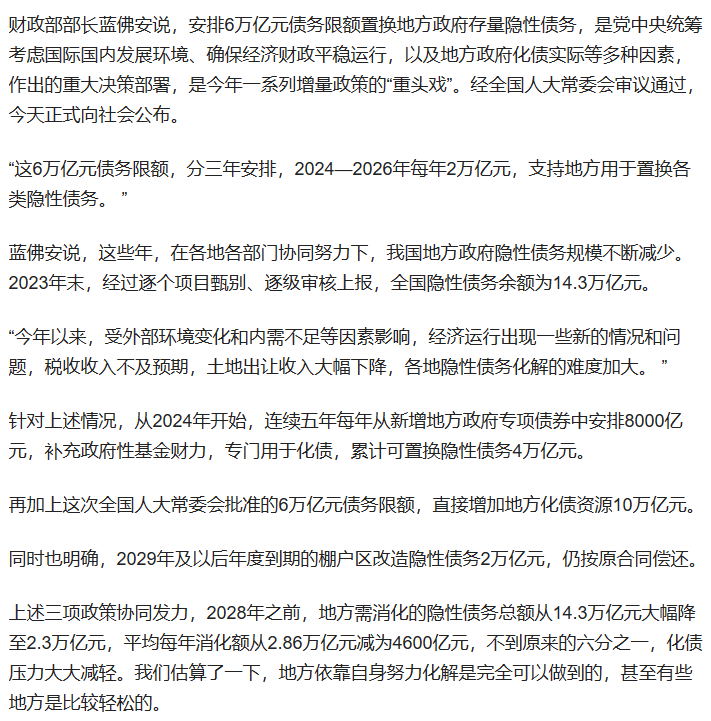 7. 個人認為是非常好的招,把民間説的60萬億城投公司隱性債,一次性基本處理完了,地方上是真的受益良多。宣傳上也是好招,無非就是50萬億地方債券+30萬億國債,這都是政府信譽,完全沒有問題的。而且還沒動用國債。外媒就沒明白過來,只能理解美國式的10萬億國債放水,拉股市。其實中國不需要大放水,150萬億居民存款出來活動就行,現在已經出來炒股了,牛市沒問題。