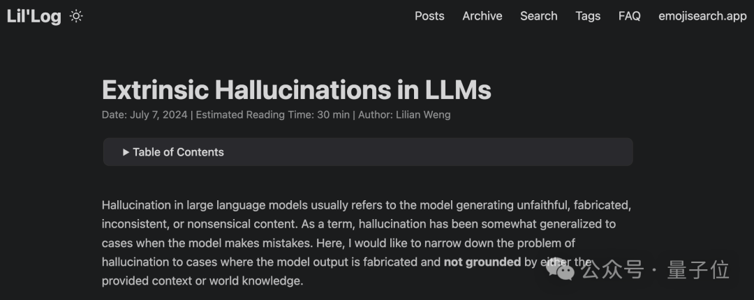 此前她提出的提出LLM外在幻覺(extrinsic hallucination)的博文也是非常火爆。