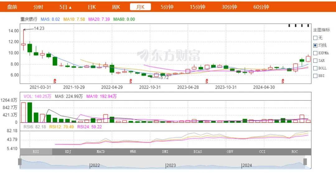 東方財富網顯示,受大盤以及中報業績雙增等因素影響,自今年9月中旬重慶銀行迎來一波上漲。截至11月8日,重慶銀行收盤價9.45元/股,較該行歷史最高點仍相差甚遠。