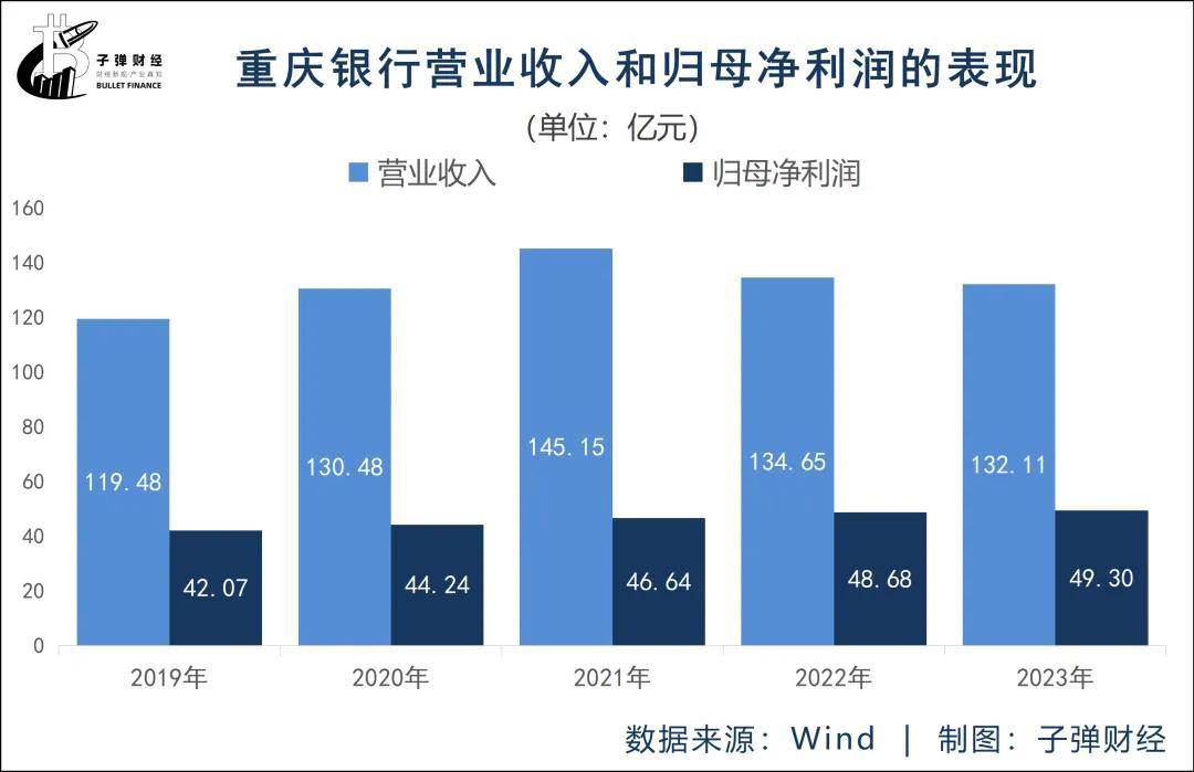歷年年報數據顯示,2021至2023年,重慶銀行歸母淨利潤分別為46.64億元、48.68億元、49.3億元;營業收入分別是145.15億元、134.65億元、132.11億元。