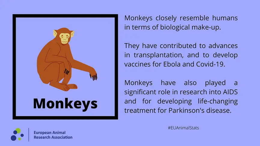 在猴子身上進行的大多數實驗都是為了解新藥的毒性,然後才能在人類身上進行測試。 老鼠和狗是這類測試的默認物種,但如果藥物對人類具有特異性,以至於對老鼠或狗沒有藥理作用,則必須使用猴子。許多生物技術衍生的藥物都是這種情況,例如治療性抗體、寡核苷酸(短 DNA 或 RNA 分子)或基因療法。猴子也用於藥物發現的早期階段,例如當一種新的潛在藥物的特定受體(如人類的受體)只存在於猴子中時。猴子還可用於艾滋病、抗癌藥物等的廣泛研究。