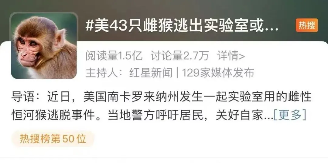 43只可能攜帶對人類致命病毒的猴子,逃離了實驗室的新聞,上了熱搜。