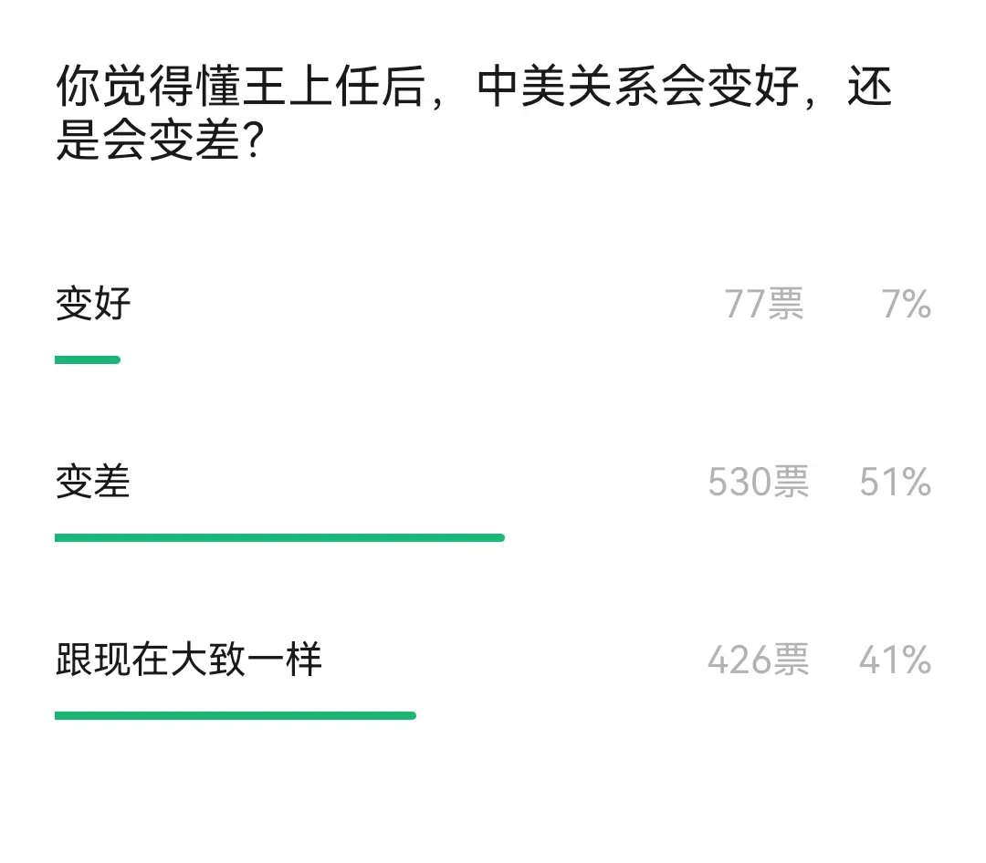 前天做了一個投票,問問大家在特朗普上台後,覺得中美關係會變好,還是變差。我發現在投票的數據中,大多數人選擇會變差,其次是跟目前大致一樣,少部分人選擇會變好。