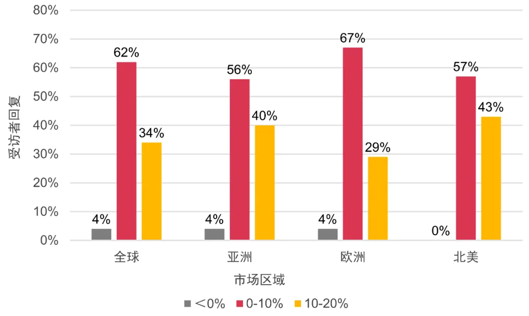 報告顯示,全球體育行業高管對行業前景普遍持積極態度,他們預測未來3-5年的年增長率將達到7.3%左右(高於去年調研中的6.6%)。同時,主要地區大部分受訪者都對未來體育市場充滿信心。在亞洲、歐洲及北美,超過半數以上的受訪者認同未來3-5年市場年增長區間在0-10%之間,分別為56%、67%及57%。