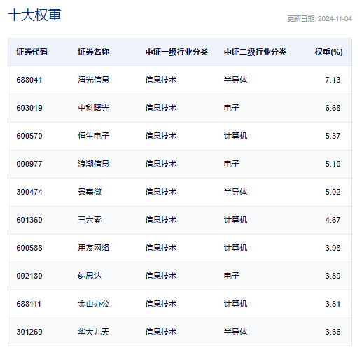 數據顯示,截至2024年11月4日,中證信息技術應用創新產業指數前十大權重股分別為海光信息、中科曙光、恒生電子、浪潮信息、景嘉微、三六零、用友網絡、納思達、金山辦公、華大九天,前十大權重股合計佔比49.31%。
