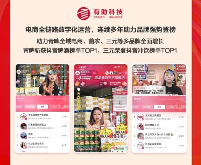 有助科技充分發揮“以內容為特色、數據為核心驅動力”的業務優勢,作為品牌的線上全域運營夥伴,為客户提供一系列創新性數字化營銷解決方案,連續多年助力品牌價值建設和營銷成效實現緊密統一。“雙11”期間,有助科技服務青島啤酒全域電商、首農、三元抖音等多品牌實現強勢增長,其中青啤斬獲抖音啤酒榜單TOP1,三元榮登抖音衝飲榜單TOP1。