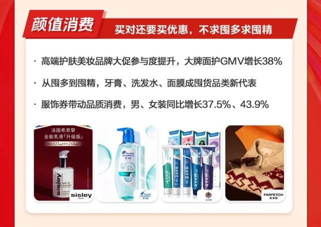 伴隨高端護膚美妝品牌大促參與度的提升,今年“雙11“,大牌面護產品GMV同比增長38%,赫蓮娜黑繃帶面霜、海藍之謎修護精粹水、後天氣丹水乳套裝成為面部護理品類GMV TOP3,CPB長管隔離霜國際版、YSL粉氣墊、NARS大白餅則在彩妝品類中脱穎而出,成為GMV最高的三款產品。同時,消費者的購物理念也日趨成熟,從“囤多”成長為理性決策按需分配的“囤精”,相對客單價更高的牙膏、洗髮水、面膜成為囤貨品類新代表,敷爾佳煙酰胺修護、理膚泉B5 Pro、歐萊雅玻尿酸安瓶三款面膜走俏市場。