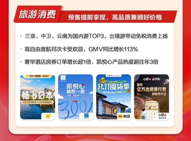 旅遊出行品類在整個“雙11”期間走勢火爆,隨着“囤旅遊”消費理念的日益深入,消費者傾向於以大促的優惠價格提前囤好機酒、景點門票等旅遊產品,並在未來根據實際需求進行預約、消費,三亞、中衞、雲南成為平台用户最青睞的國內旅遊目的地,滑雪勝地和海島成為囤貨首選。以南航、東航、全日空和日航為代表的國內國外航班次卡憑藉自由兑換的優勢,GMV同比增長113%。奢華酒店房券訂單增長超1倍,其中凱悦心產品熱度超往年3倍,再次印證了這屆消費者兼顧高品質和性價比的理性決策思路。