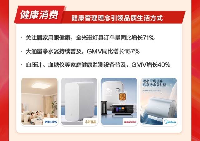 健康消費成為本次“雙11”的一大增長亮點。能夠模擬自然光線、降低眼部疲勞的全光譜燈具訂單量同比增長71%;淨水器的剛需屬性在居家場景中逐步加強,GMV同比增長157%,以小米MR1282-B 1200G Pro反滲透淨水器、海爾1200G pro鮮活水淨水器、美的星河系列1000G Pro反滲透淨水器等為代表的大通量淨水器憑藉出水快、0陳水的優勢得到諸多消費者追捧。用於疾病監測與預防的家用健康檢測設備消費有明顯提升,GMV同比增長40%,“居家養生”需求持續湧現,血壓計、霧化器、血糖儀等成交量增長迅猛。