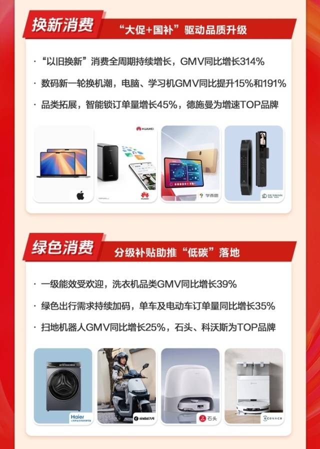 國補的品類拓展讓更多科技智能產品迎來換新高峯。學習機GMV同比增長191%,Alpha Egg D1 Pro AI詞典筆、ListeneerK9 AI智能復讀機、有道X7 Pro詞典筆成為品類GMV 前三甲。單車和電動車訂單量同比增長35%,九號機械師MMAX2 110P智能電動自行車位居品類GMV第一;清潔家電中掃地機器人GMV同比增長25%,石頭、雲鯨和科沃斯旗下產品包攬品類GMV前5。智能鎖訂單量同比提升45%,小米智能門鎖2 Pro領跑行業。