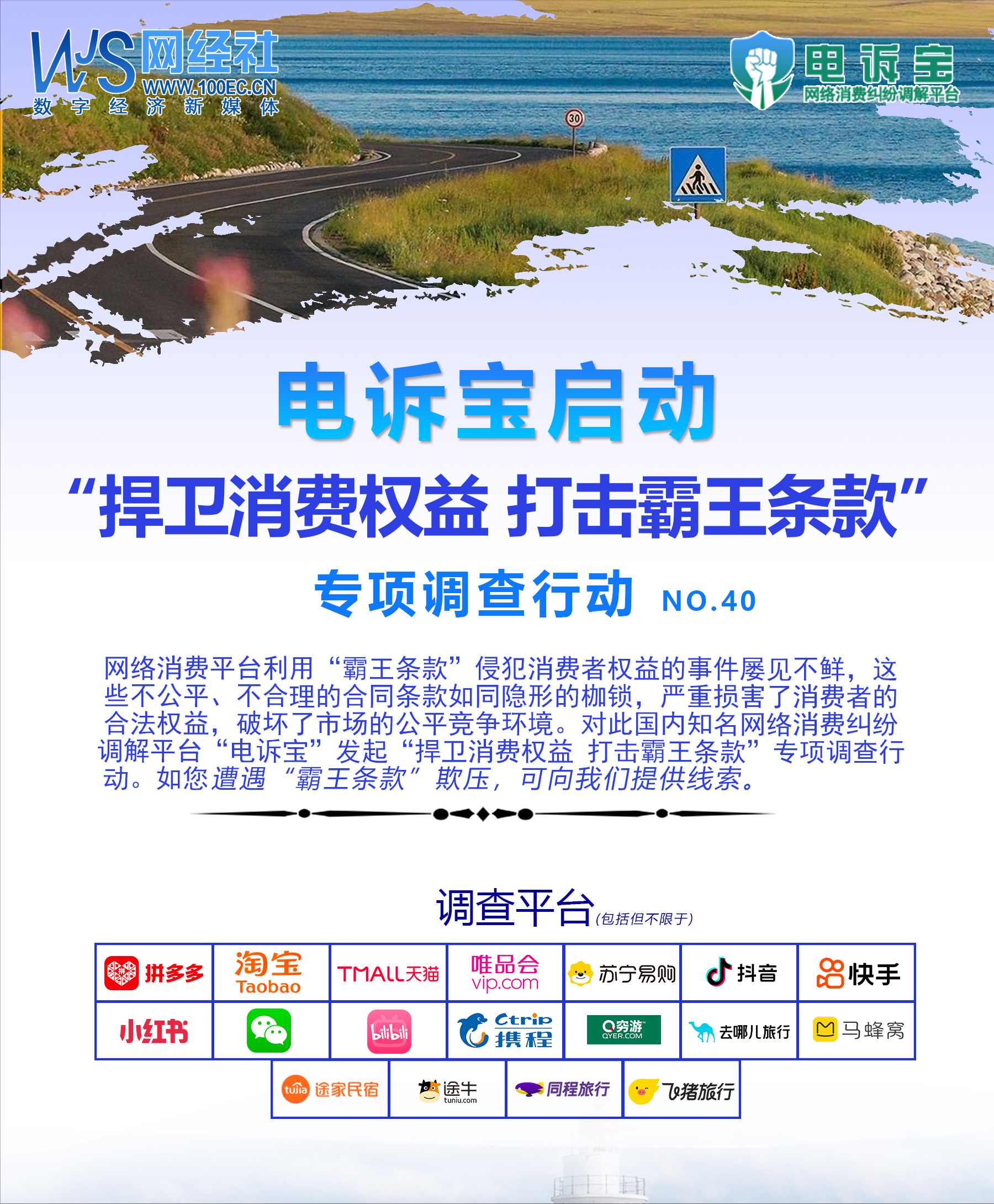 11月6日,網絡消費糾紛調解平台“電訴寶”發起“捍衞消費權益 打擊霸王條款”專項調查行動。如您在網絡消費平台遭遇“霸王條款”欺壓,可向我們提供線索。