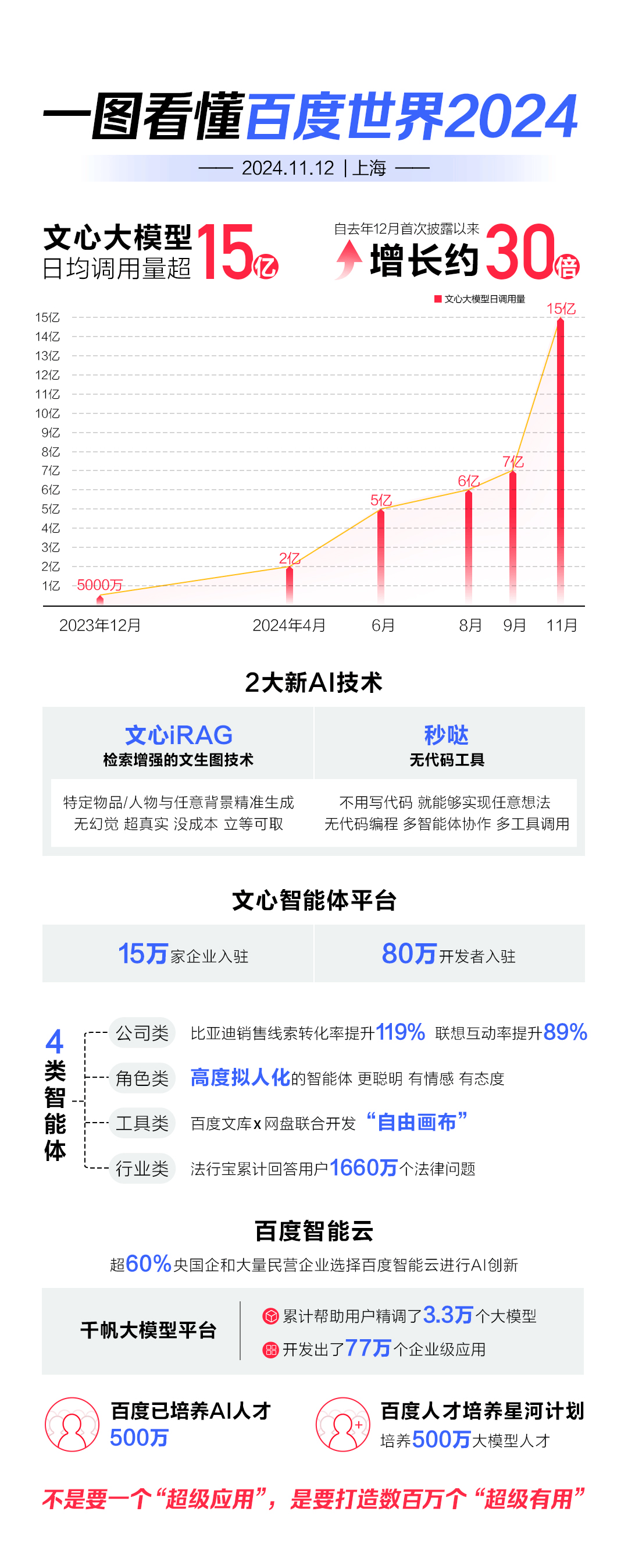 **截至11月初,百度文心大模型的日均調用量已經超過15億,相較一年前首次披露的5000萬次,增長約30倍。**李彥宏在大會現場表示“增速超出預期”,説明AI是真需求。他感慨,這條陡峭的增長曲線,代表着過去兩年中國大模型應用的爆發。