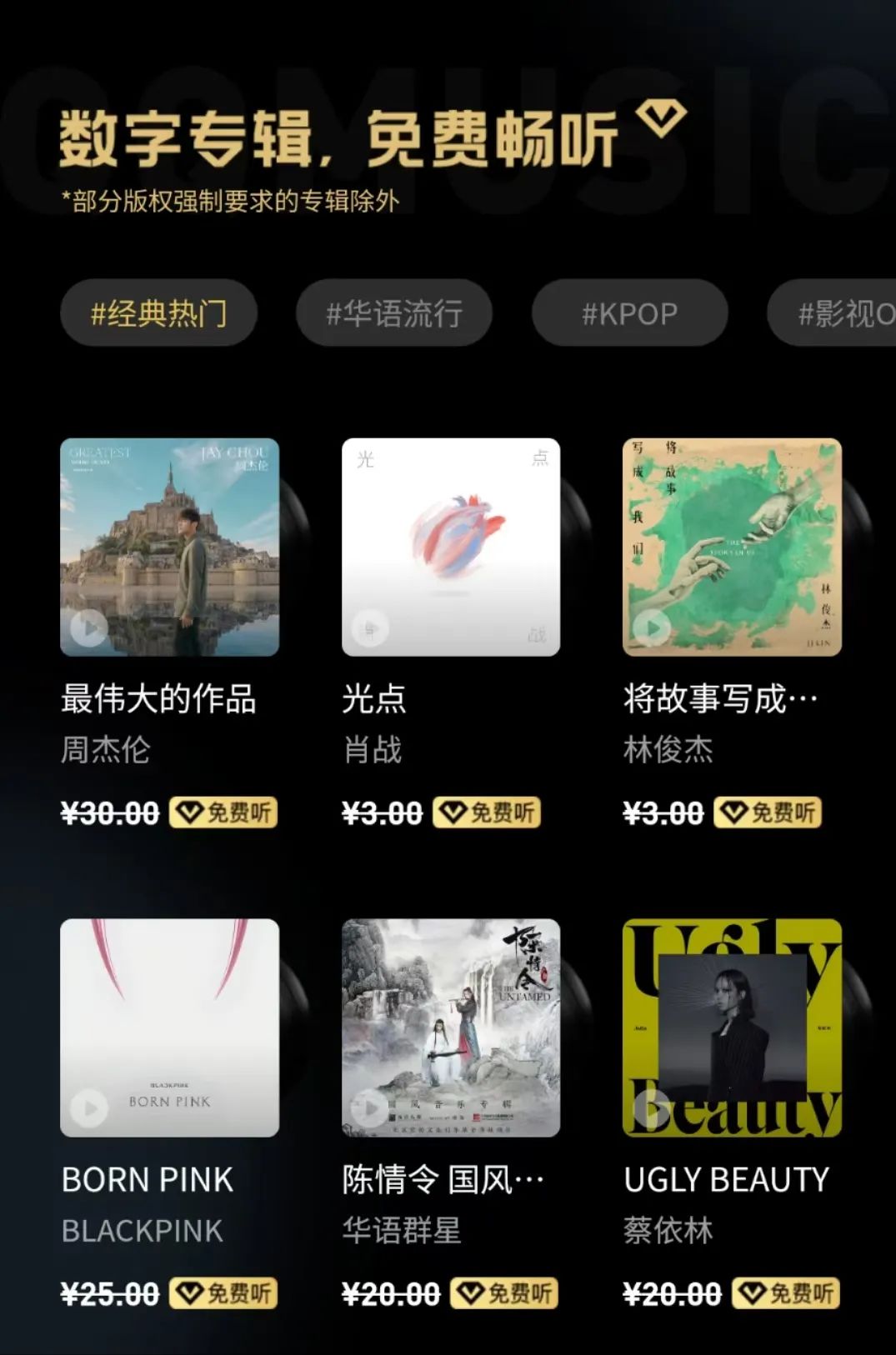 對擁有更高音樂需求的用户,騰訊音樂提供了更進一步的內容權益與會員體驗。目前,騰訊音樂為超級會員提供了更多可免費暢聽的數字專輯,包括周杰倫《最偉大的作品》、林俊杰《將故事寫成我們》、蔡依林《UGLY BEAUTY》、王一博《旁觀者》等豐富優質的數字專輯內容。