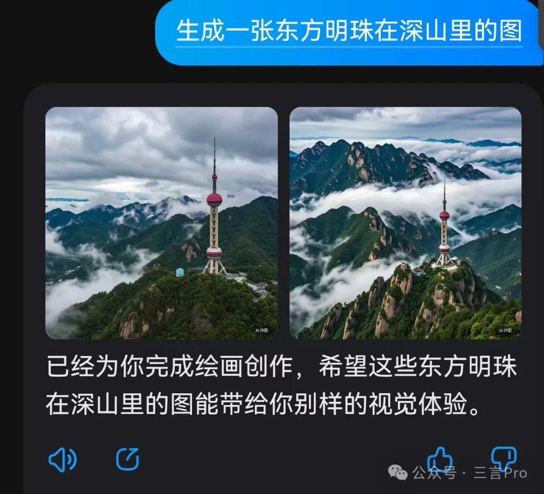 文心一言對文生圖要求比較嚴謹,不僅體現出東方明珠電視塔在深山的概念,同時也比較符合邏輯地描繪出電視塔的地基等信息。