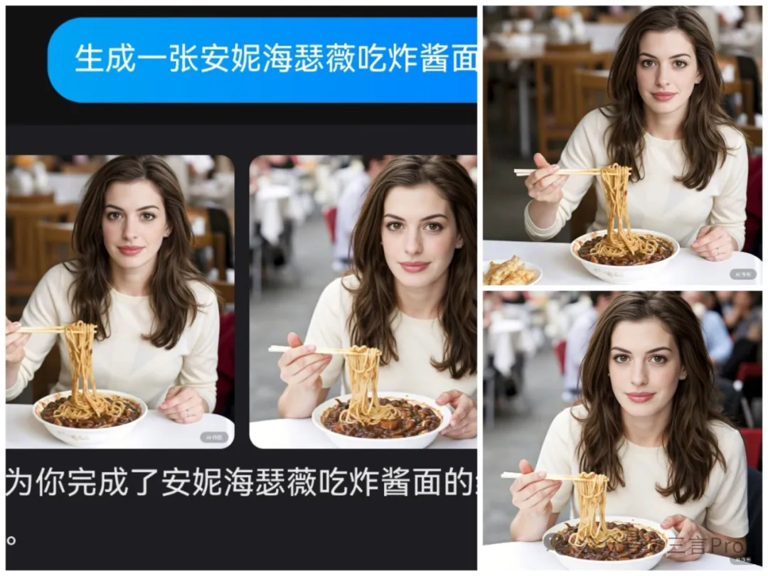 文心一言生成了兩張安妮海瑟薇吃炸醬麪的圖片,同樣,兩張圖中海瑟薇的細節特徵拉滿,炸醬麪、人物手部等也都準確;