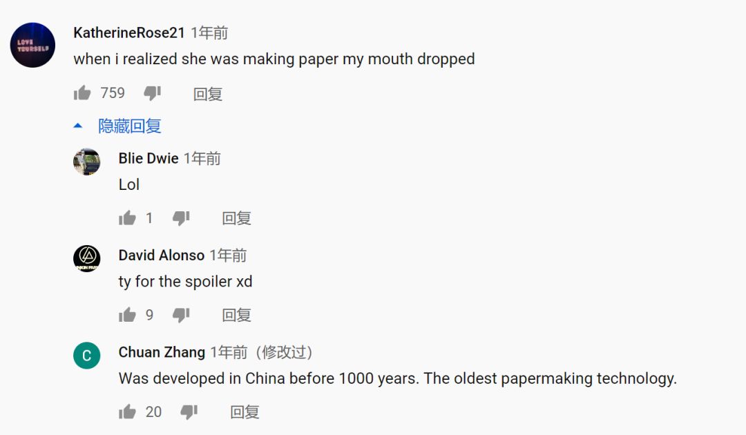 在李子柒做“古法長安紙”的視頻下,很多外國人因為這樣的造紙方法驚掉了下巴,然後又有中國人用英語給他們科普這是很早以前就有的造紙術。