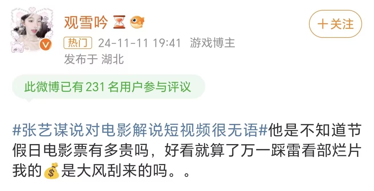 像最近著名導演張藝謀也曾吐槽過網上流行的電影解説短視頻,他認為電影院觀影的儀式感與沉浸感是線上無法替代的,觀眾們應該走進電影院,親身體驗大屏幕帶來的視聽盛宴,而非僅通過手機快速瀏覽電影解説。