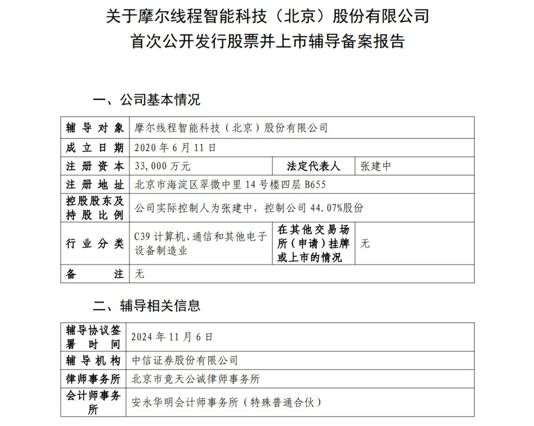 11月13日,據證監會官網顯示,國內全功能GPU獨角獸企業摩爾線程智能科技(北京)股份有限公司在北京證監局辦理輔導備案登記,正式啓動A股上市進程,輔導機構為中信證券股份有限公司,備案時間為11月12日。備案信息顯示:摩爾線程成立於2020年10月,註冊資本為3.3億元,實際控制人為張建中,持有公司股份為44.07%。