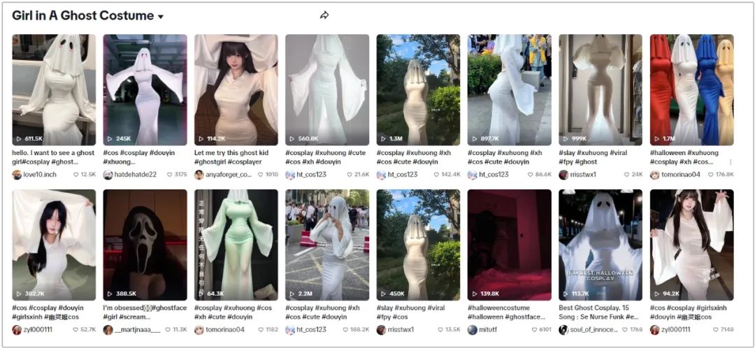**後來,這套造型成了爆火的時尚單品。**國內各平台,都有人在模仿它,抖音和阿B已經被幽靈娘大軍入侵了,因為它就像之前的毒液蜘蛛俠擦邊戰衣,什麼都遮住,但又彷彿什麼都露了,非常適合本地環境。