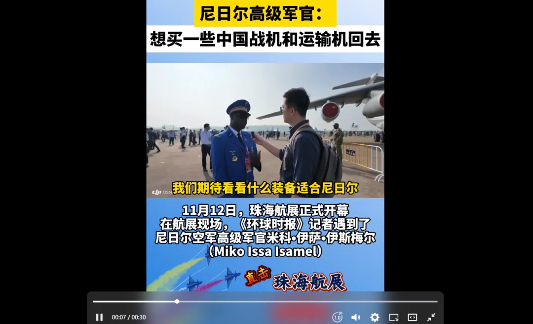 據《環球時報》記者報道,在現場遇到了尼日爾空軍高級軍官米科·伊薩·伊斯梅爾。他表示,這是首次來珠海航展,期待看看什麼裝備適合尼日爾,希望能買一些中國裝備,來保護國家安全。