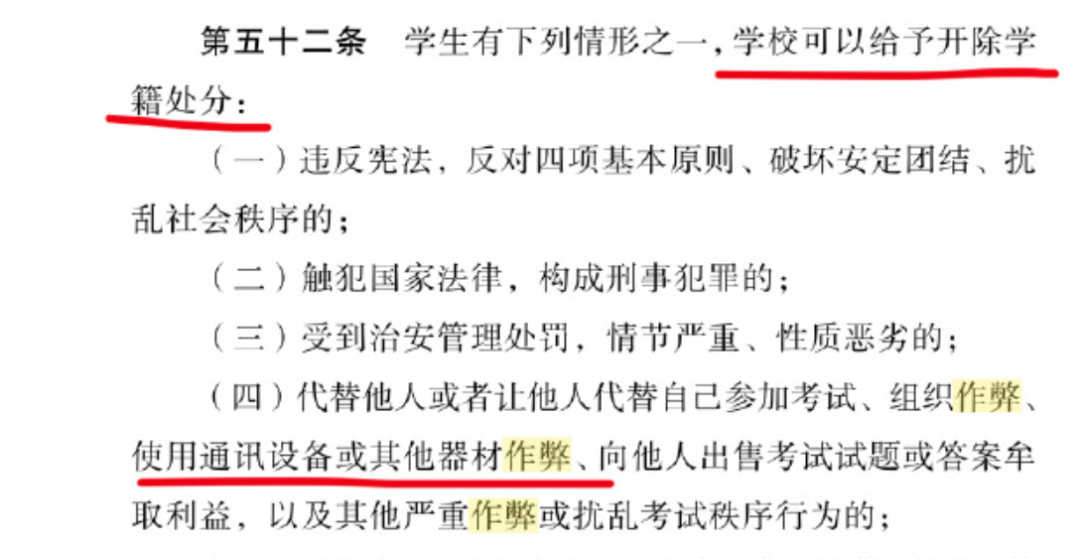 我讀本科的時候,輔導員作始業教育,很明確地説,浙大三條高壓線,一條是打架,一條是作弊,誰碰開除誰。後來自己當了教務處長,也和一些兄弟院校交流過關於如何處理作弊的經驗。有的學校為了防止有人打招呼託關係,事先印好一堆“大字報”,只留着名字學號專業和考試科目是空白,然後蓋好學校公章,發現學生作弊先收繳通訊工具,然後把空白處一填,那邊就辦退學手續,一氣呵成,根本不給學生任何反應時間。