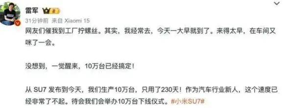 「沒想到,一覺醒來,10萬台已經搞定,從SU7發佈到今天,我們生產10萬台,只用了230天,作為汽車行業新人,這個速度已經非常了不起,待會我們將舉辦10萬台下線儀式」。