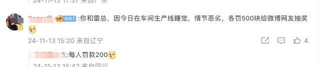 也有網友表示:「你和雷總,因今日在車間生產線睡覺,情節惡劣,各罰500塊給微博網友抽獎」