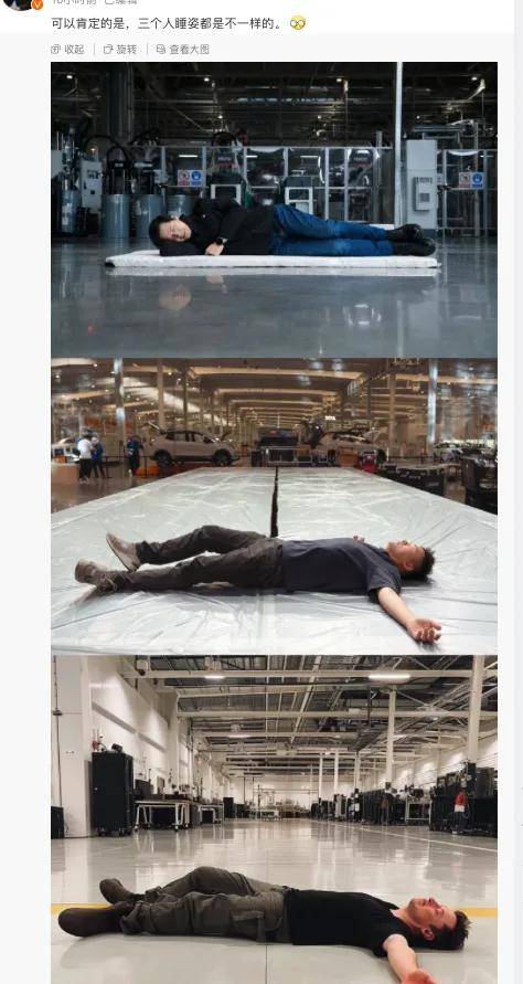 還有人表示:「馬斯克像幹完活,躺地就睡的,其他兩個,差點意思」「就是,咱們這三千萬台了才有資格睡工廠,隔壁小雷才擰了十萬台就想摸魚,成何體統」
