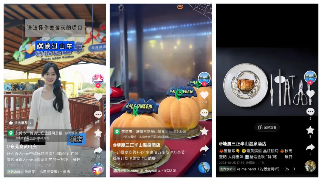 據統計,截至2024年10月,抖音平台上展現東莞文旅內容的短視頻6.1億條,收穫了273億點贊。僅在“東莞探店”這一話題下,抖音視頻累計播放次數就高達23.3億。
