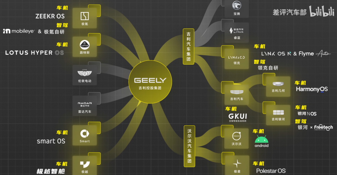 因為很搞笑的是,就在這個宣言發佈前沒幾天我們還在差評汽車部的小破站上發了一期視頻,對吉利的多品牌找略進行了一波輸出拉滿的指指點點,它們真的實在是太雜太亂了。