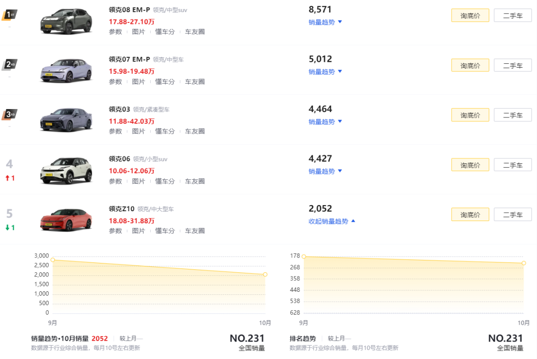 除去銷量一直都還不錯的領克 08 以外,包括領克 07 、領克 Z10 在內的諸多新車其實都沒有達到預期的走量效果。特別是 Z10 ,都已經降價兩三回了還是不聲不響的,相比有 7X 、 001 、 007 多點開花,後續還有一票新車的極氪來説,確實也稍顯遜色。