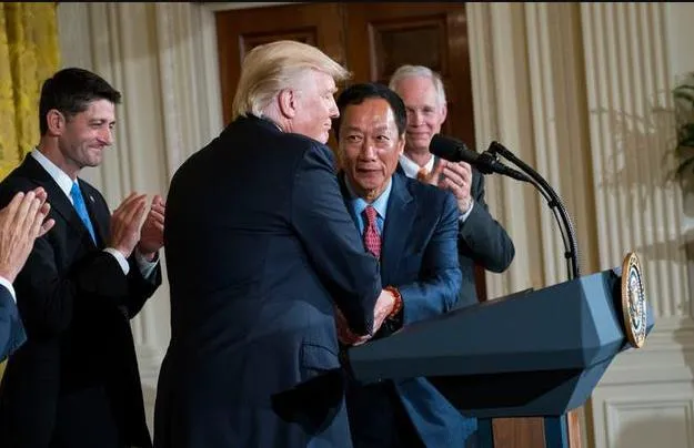 二次有心角逐島內大選,均無功而返,反而惹了一身腥。在特朗普首次執政時,郭台銘做起“美國夢”,他走進白宮,高調宣稱百億投資美國,還承諾為威斯康辛州樂觀地創造1.3萬工作機會,打造“威斯康谷”,與硅谷看齊。2017年,特朗普與他為威斯康辛州工廠填土動工之時,曾開心地表示“美國繁榮就在眼前!”,還誇郭台銘是“最偉大的商人”。