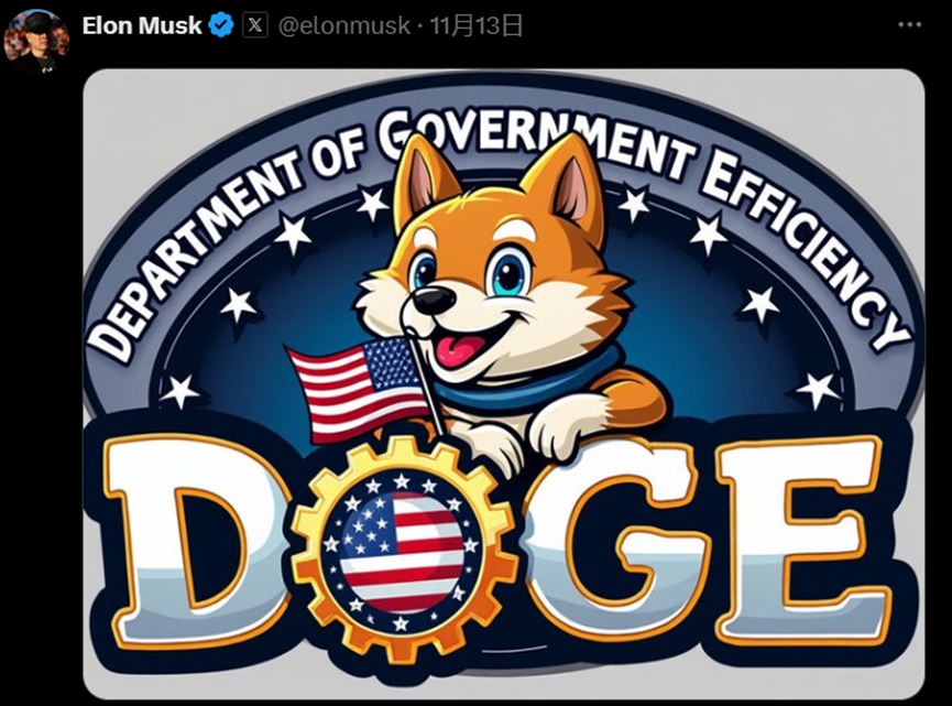 馬斯克還發了個圖,把這個“政府效率部”用柴犬作為標誌,顯然是有意將這個“DOGE”跟馬斯克之前力推的狗狗幣關聯起來。