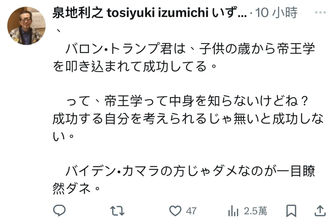 “巴倫自幼就接受‘帝王學’教育,因此取得了成功。雖然我不太清楚‘帝王學’的內容,但是如果你不去設想自己會成功,那麼你永遠都不會成功。顯然拜登和哈里斯是對孩子的教育是完全不行的。”