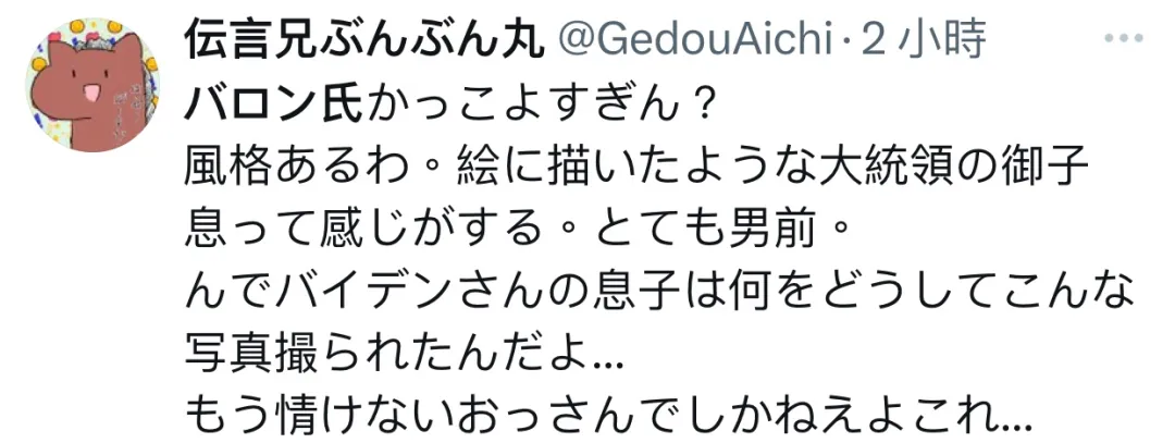 “巴倫會不會太酷啦?他真的很優雅,給人的感覺就是一個完美的總統兒子,非常帥。相比之下,拜登的兒子為啥是這樣的啊?拜登真是個可憐的老頭。”