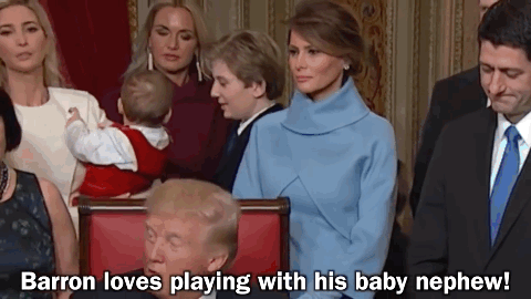 老爸在白宮簽署他第一份行政命令,身為小叔叔的巴倫正在逗自己六個月大的侄子玩。