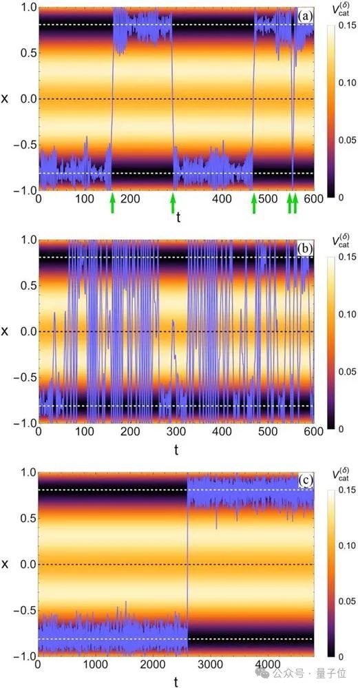 (a)顯示貓可能突然從一個平衡點跑到另一個平衡點,在那裏停留一段時間,然後再次隨機地回到上一個平衡點。(b)為小貓(c)為老年貓