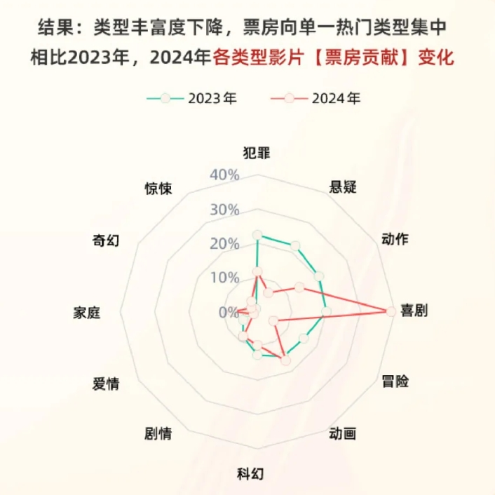 報告中展示了,2024年院線市場中喜劇類型片的強勢表現,其票房貢獻度比往年有了十分強勁的增長,反過來,其它類型影片則均有不同程度的下滑。