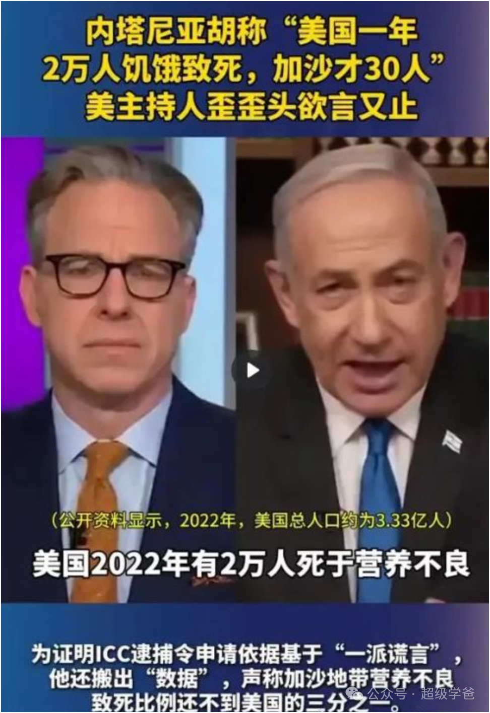 有人指責以色列在加沙地帶製造人道主義危機,內塔尼亞胡用美國的數據進行了反擊,説2022年美國有兩萬人死於營養不良,這比加沙地帶的比例還要高……(論美國兒子的妙用)。