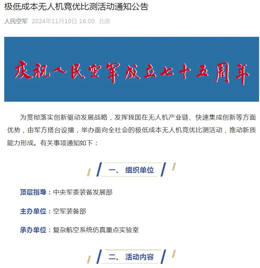 2024年11月10日,中國人民空軍舉辦了“極低成本無人機競優比測活動”,邀請全社會的無人機企業來打擂台。