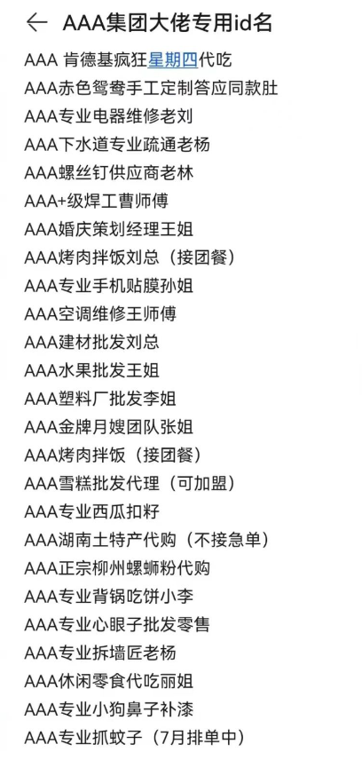 就像是momo大軍是為了防止被搜索和騷擾,前段時間大家跟風把名字改成了“AAA-建材批發X哥”一樣。