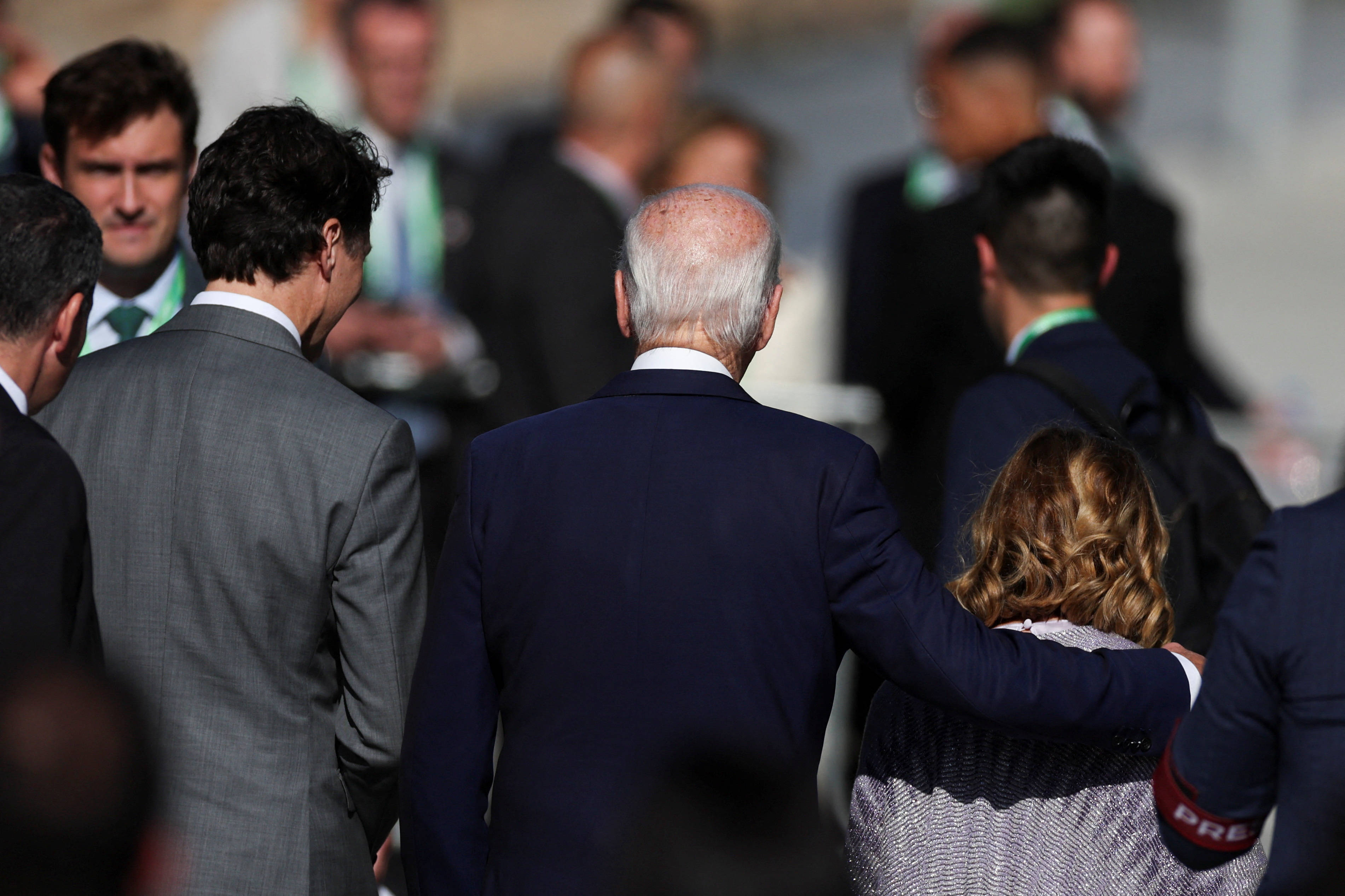 11月18日,美國總統拜登(中)、加拿大總理特魯多(左)和意大利總理梅洛尼在里約熱內盧離開G20“全家福”拍攝現場。(路