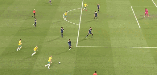 在中後場的纏鬥中,中國隊也護住了球權,等到謝文能發動反擊時,日本隊球員第一時間沒有看穿中國隊的戰術意圖。前場齊頭並進的箭頭球員,讓日本隊都忽略了遠端跑位的林良銘,只有韋世豪一眼就看到了他。