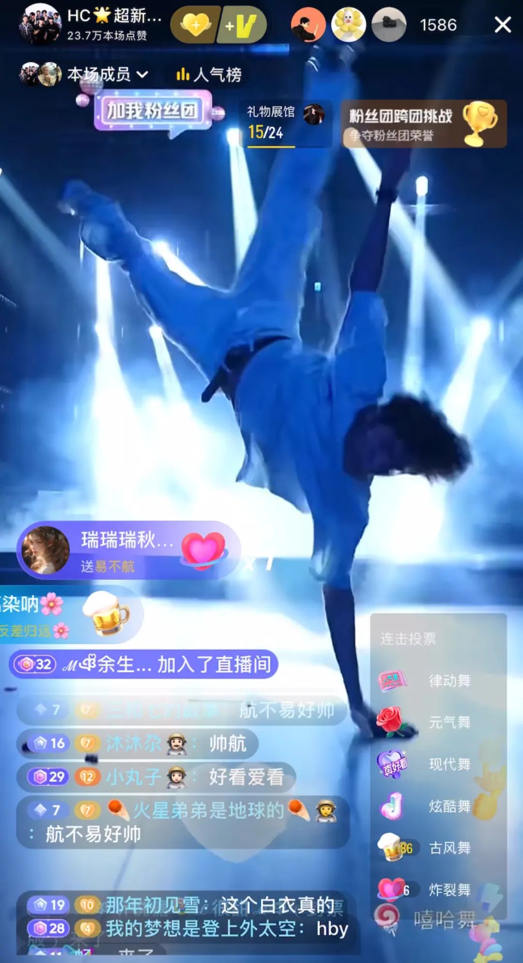在歌舞垂類板塊,不僅有劇情向古風團,還有風格多元的現代團。比如,街舞廠牌“HC超新星”作為舞台感街舞團,坐擁一百多平的直播間,投入近八十萬。