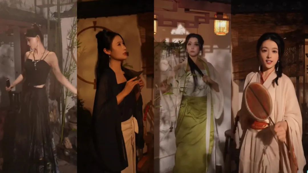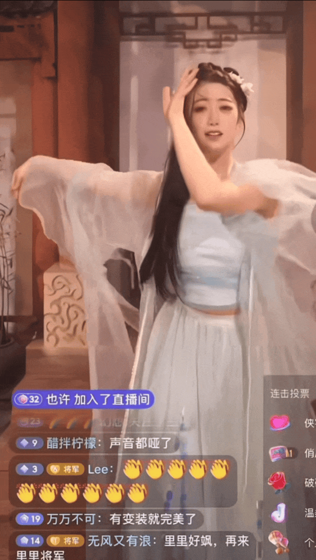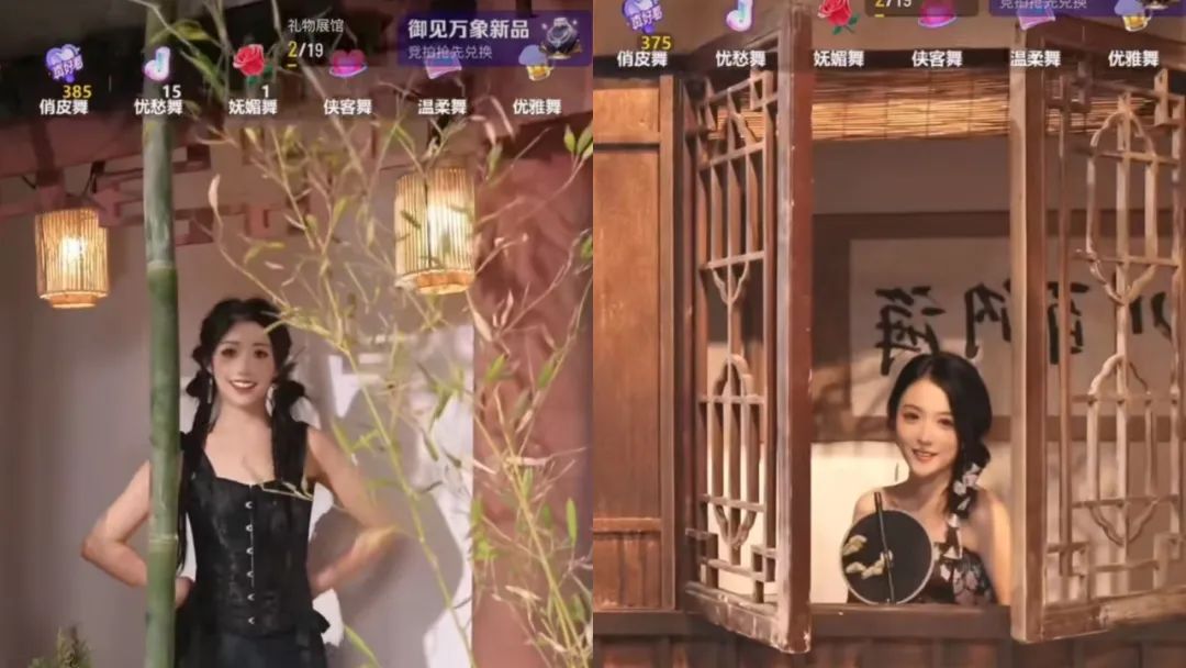 有的團卷劇情,卷特效,有的團卷場景。同樣是古風團,“夢迴春秋”則以古色古香的實景讓人眼前一亮。在三面環形長廊裏,有拿着團扇輕搖的公主、有坐在燭影旁的醫者、有舞刀弄劍的女俠,不同成員化身不同角色,不僅有專屬小場景、風格多元的服裝造型,直播開場時還有獨特的亮相風格,配合或柔美的中國舞,或颯爽的爵士舞,展現古風古韻、國潮魅力。