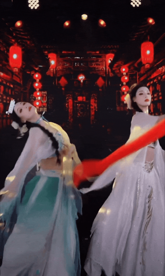 將中國舞和“變裝”相結合則是她們擅長的形式。比如,直播間裏,本來是一對穿着絲裙的舞者,正在跳提線木偶舞,她們會突然“變裝”成一對畫着精緻妝容、穿着傳統服飾的雙生傀儡。
